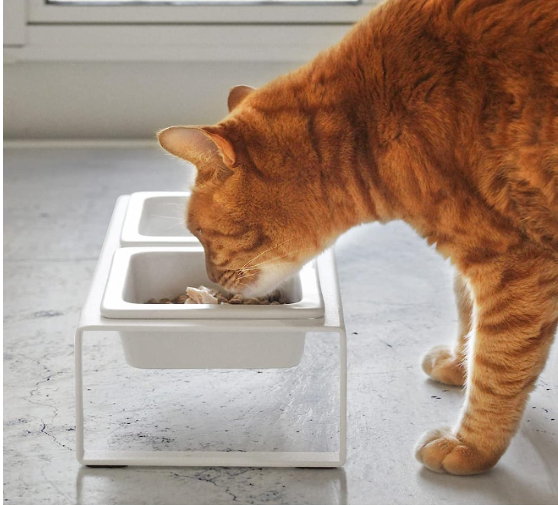 食器が床に直接置かれているなど位置が低すぎると、猫は深く頭を下げて食べる必要があり、重力の影響で口の中のフードが外へこぼれ落ちやすくなります。猫の首や背中への負担を減らすために、食事台を使って食器を数センチ高くしたり、少し手前に傾斜がついた「猫工学」に基づく食器を使用したりすることで、自然な姿勢で食べられるようになり食べこぼしが改善されることが多いです。