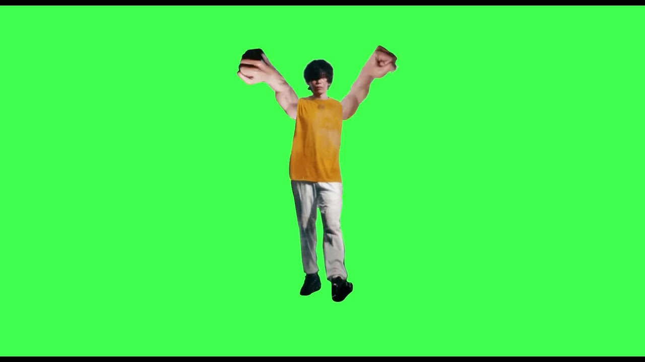 やたら腕だけムキムキな米津玄師が「はっぴーはっぴー」と連呼するGIF、背景グリーンバック動画。